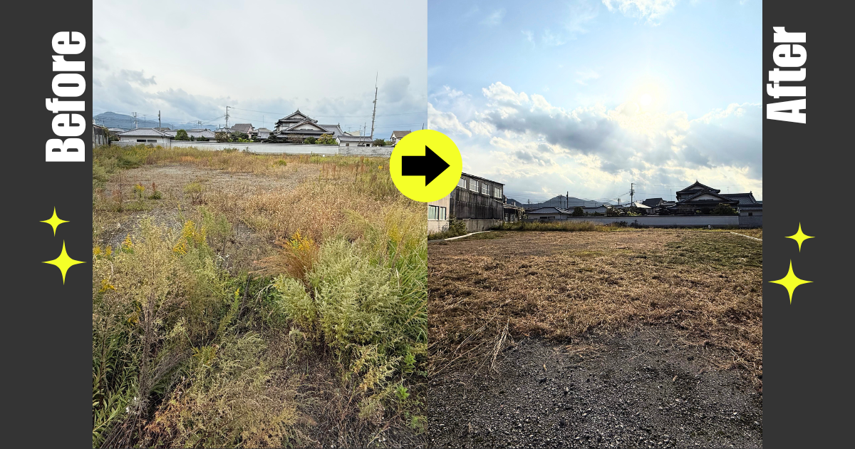 西条市神拝乙エリアにて、約800平米の手付かずの荒れ地整備を実施しました。6〜8時間の作業で、長年放置されていた空き地を見違えるほどスッキリと整備。